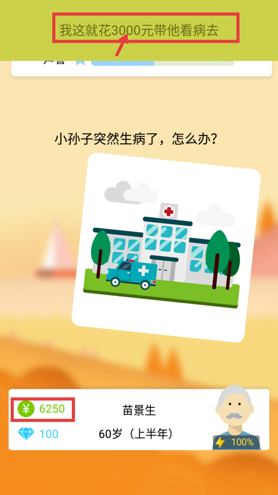 3、带孙子时遇其生病,选择花【3000元】带他看病,处理突发状况以保障后续生活。