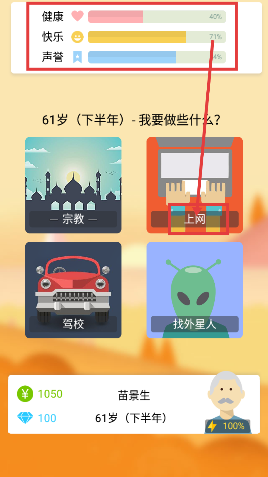 4、到61岁下半年,健康等属性变化后,选择【上网】活动,继续丰富老年生活并影响属性。
