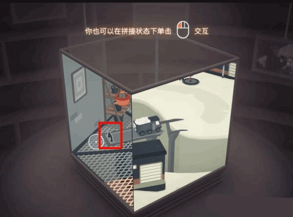 我们可以利用桌子上的台灯进行拼接,从而将仓库门前地面上的井盖抬起,打开立方体上部的画面。