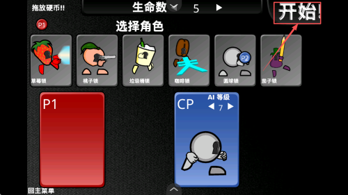 4、如何开始战斗:在角色选择界面拖放硬币选择角色,点击“开始!”进入战斗。