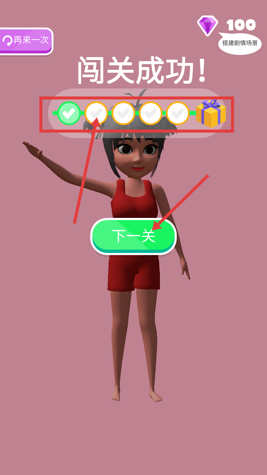 4、闯关成功后,点击【下一关】,继续挑战后续关卡,获取关卡奖励。