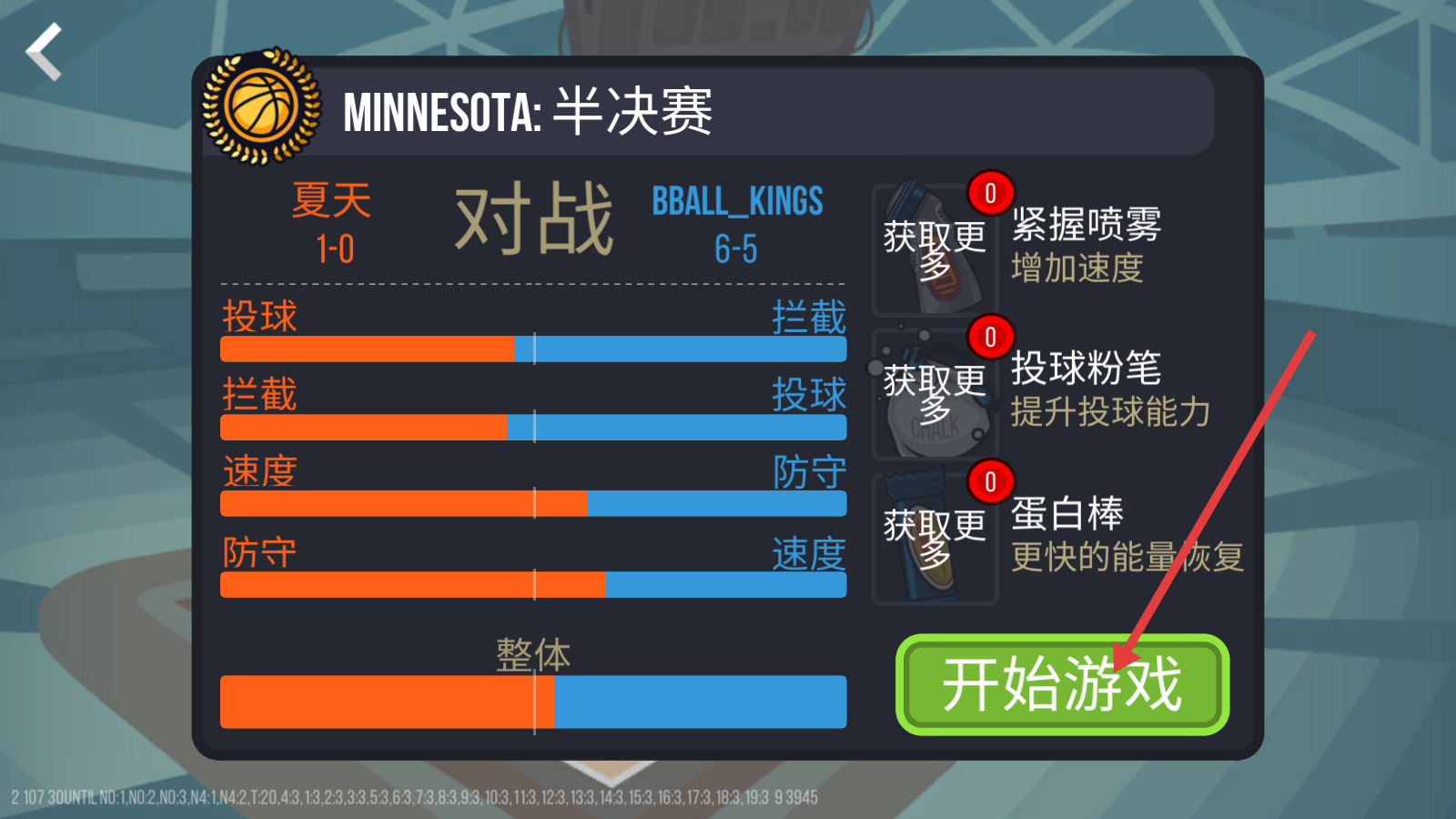 1、在半决赛对战界面,点击【开始游戏】,开启与BBALL-KINGS的对决,利用属性优势推进比赛。
