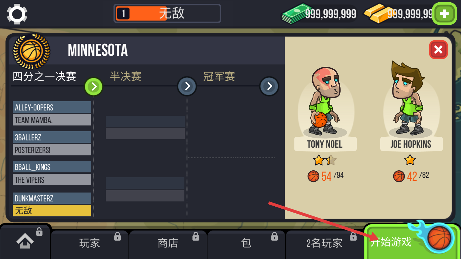 1、在赛事界面选好队伍后,点击【开始游戏】,进入篮球对决,开启四分之一决赛的竞技挑战。