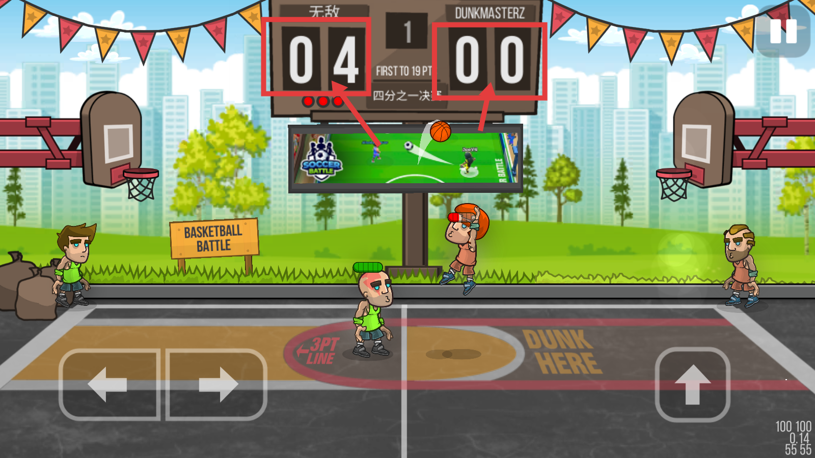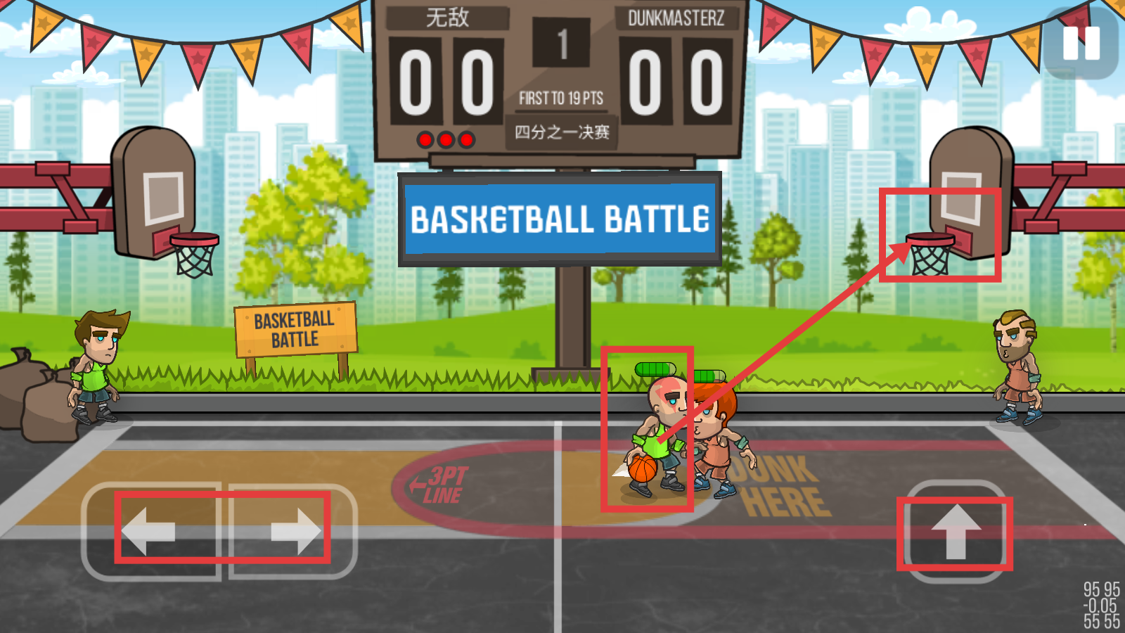 2、比赛时用左右方向键移动角色,点击【向上】键投篮,瞄准篮筐,争夺分数优势。