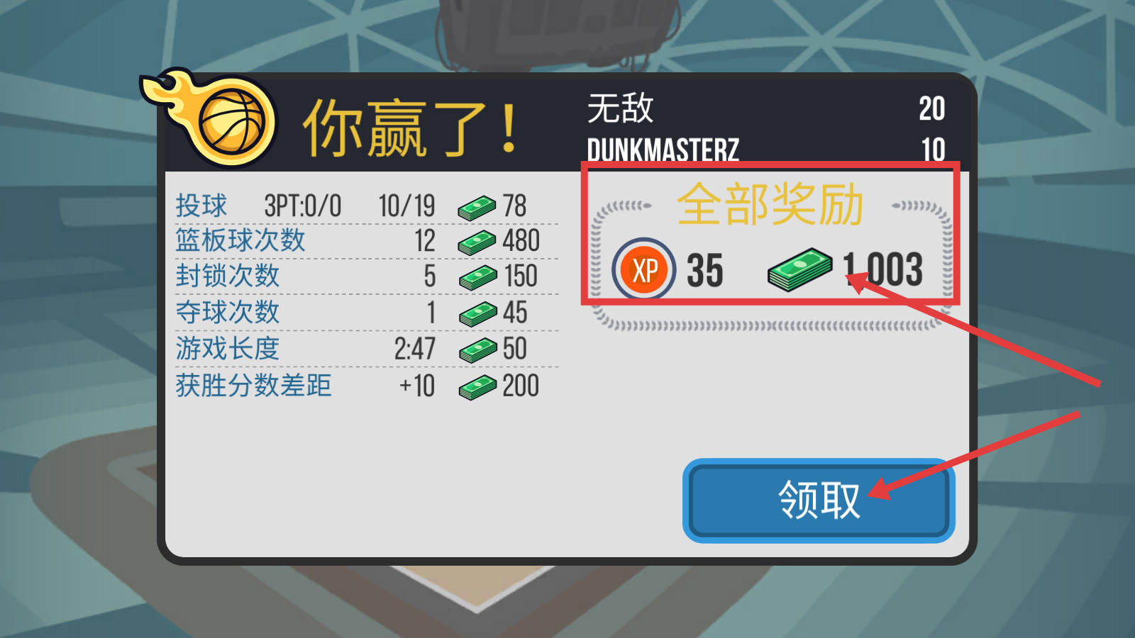 4、获胜后点击【领取】,获取【XP-35】和【1003】金币奖励,积累资源提升球员战力。
