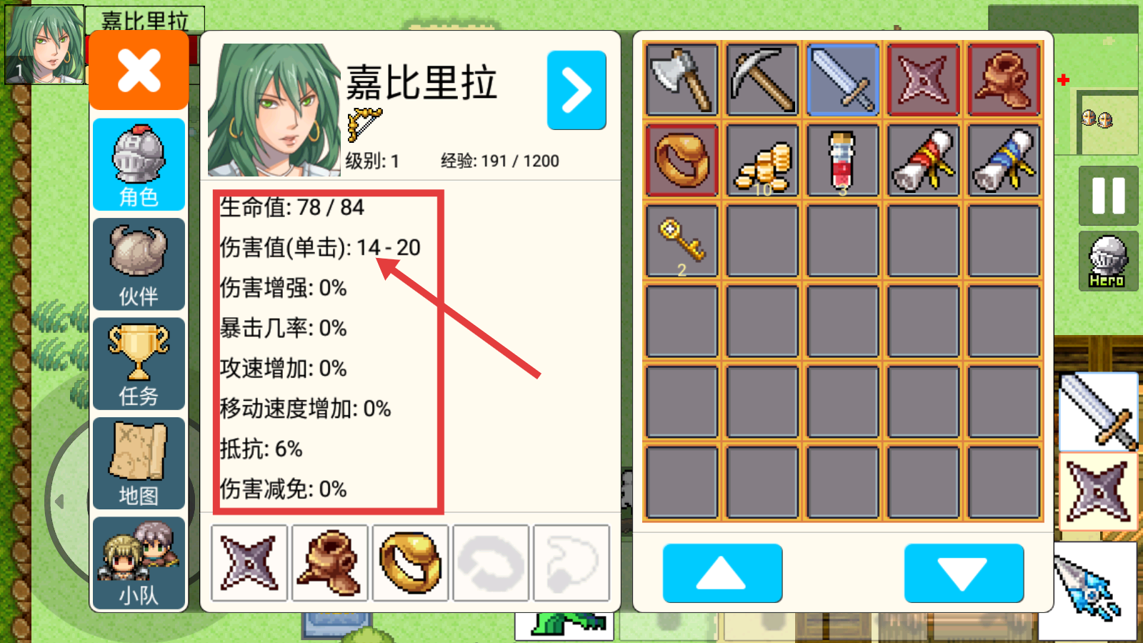 1、查看【嘉比里拉】角色界面,关注【伤害值-14-20】等属性,了解角色能力,为战斗和探索做准备。
