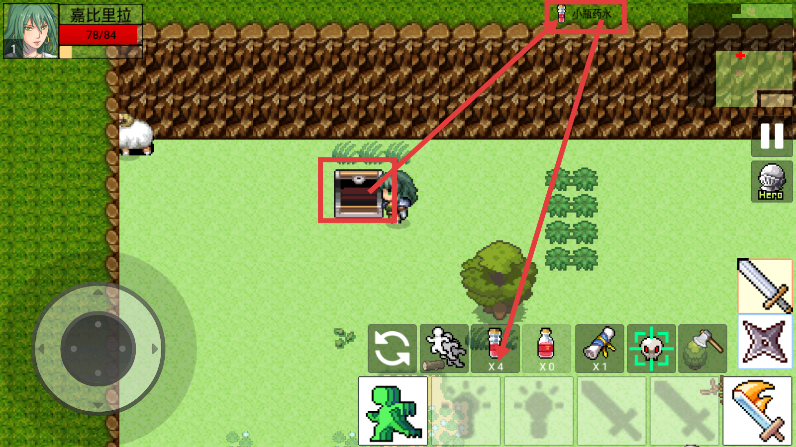 3、开启【宝箱】可获得【小瓶药水-X4】等补给道具,及时收集以维持生命值,应对后续挑战。