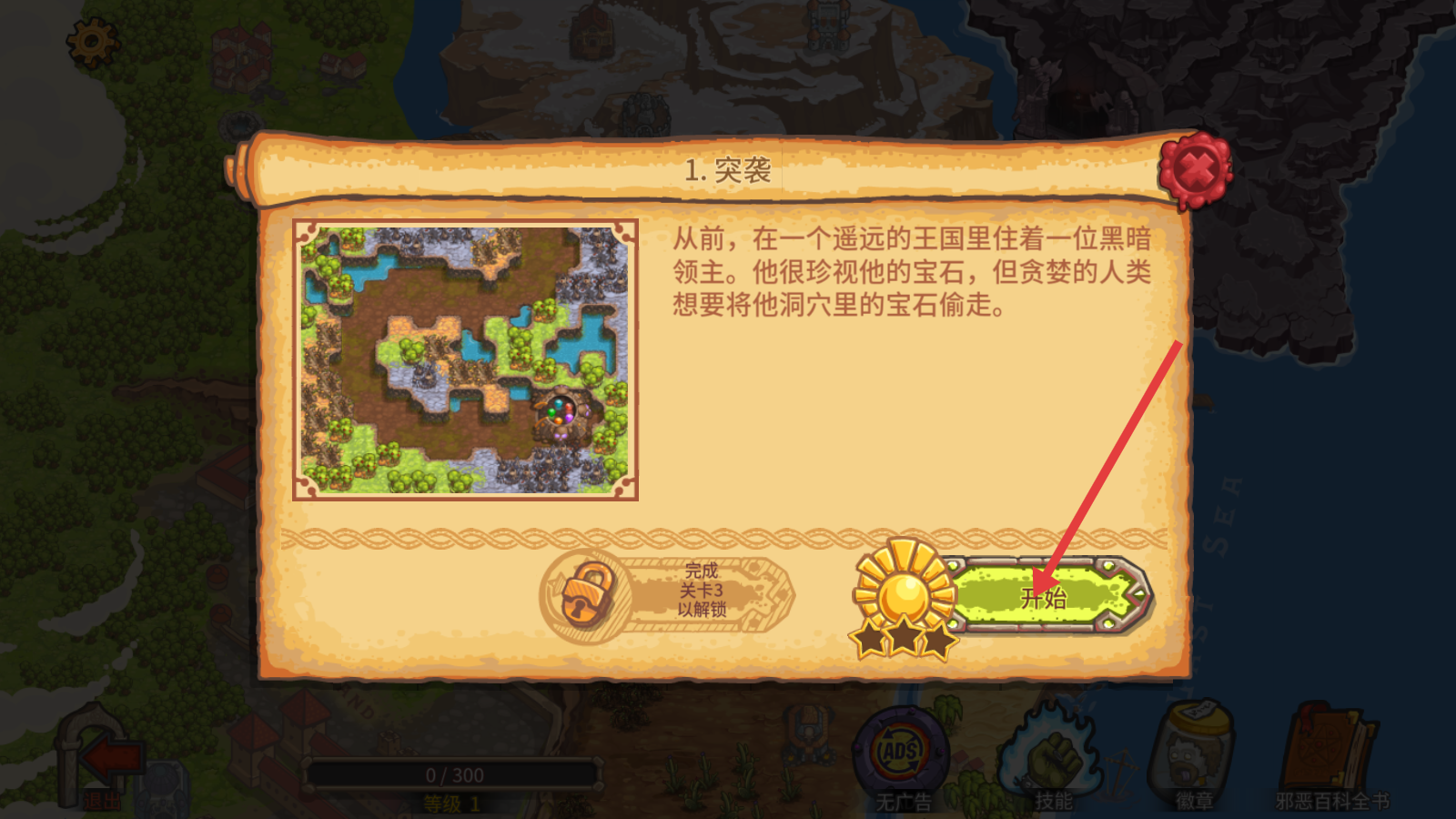 1、选择【突袭】关卡,点击【开始】开启战斗,了解黑暗领主宝石被觊觎的背景,开启防守挑战。