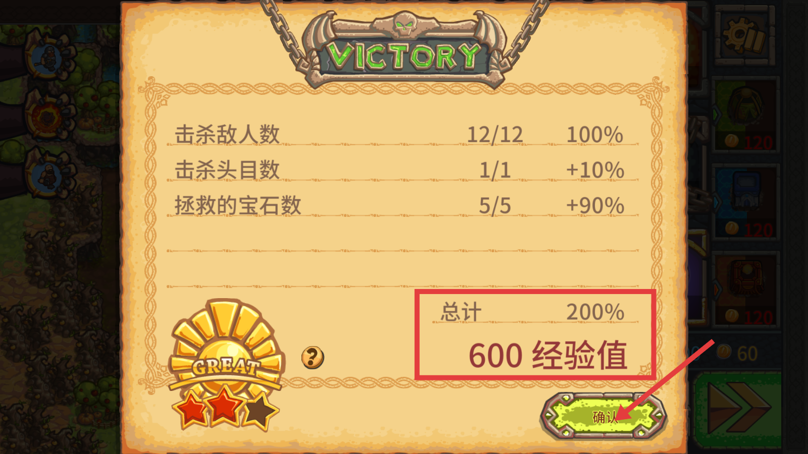 4、达成胜利后,获取【600-经验值】,点击【确认】领取奖励,提升等级解锁新内容。