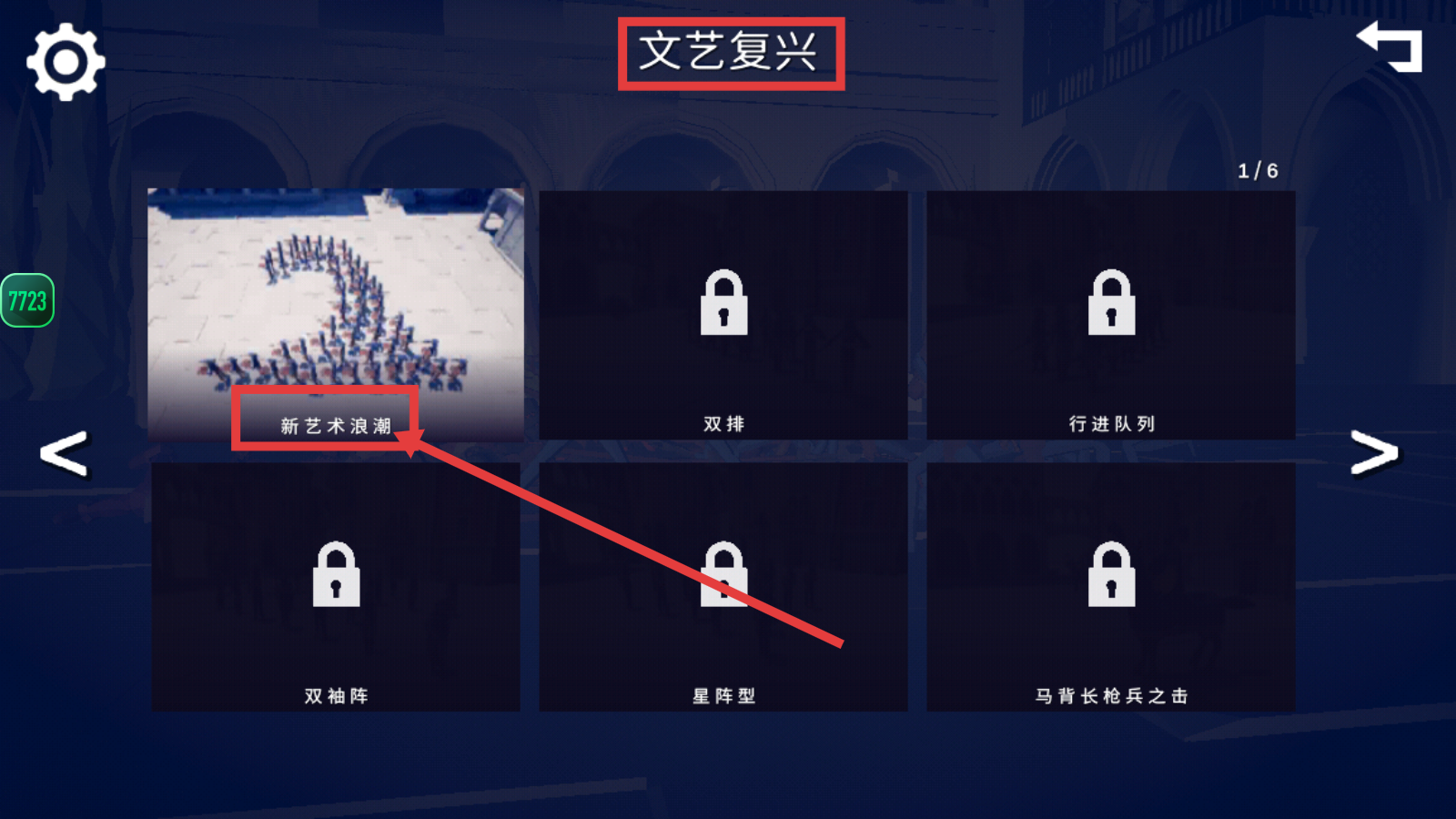 1、进入游戏后选择【文艺复兴-新艺术浪潮】关卡,开启该主题战斗,体验特色阵型与兵种玩法。