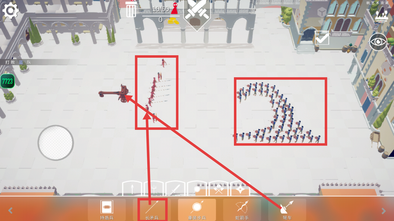 2、战斗前利用初始资源招募【长矛兵】等兵种,合理布置兵力,为对抗蓝队构建战斗阵容。