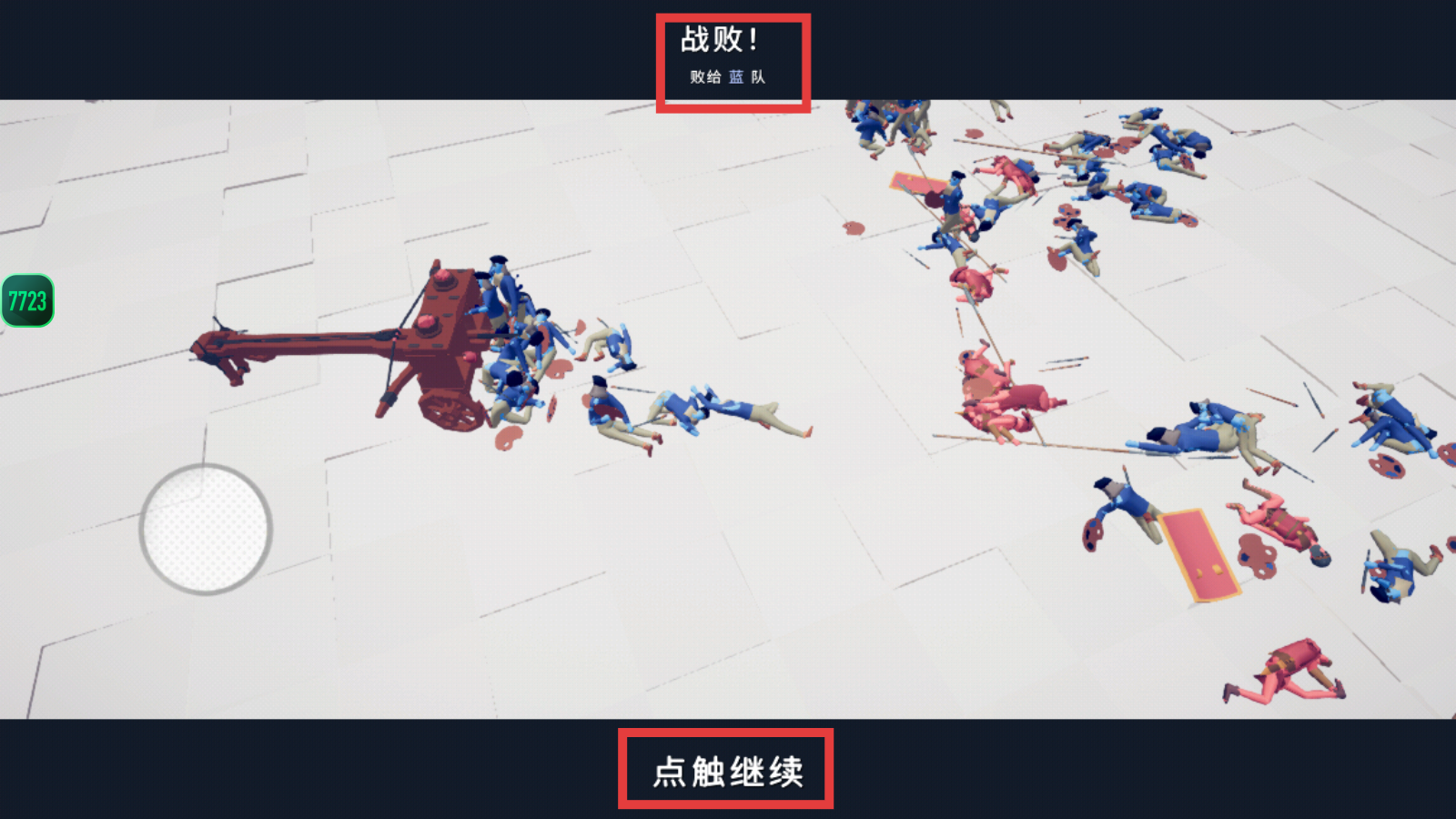 4、若出现【战败!-败给蓝队】,点触继续后总结失败原因,调整兵种搭配与战术,重新挑战以获取胜利。