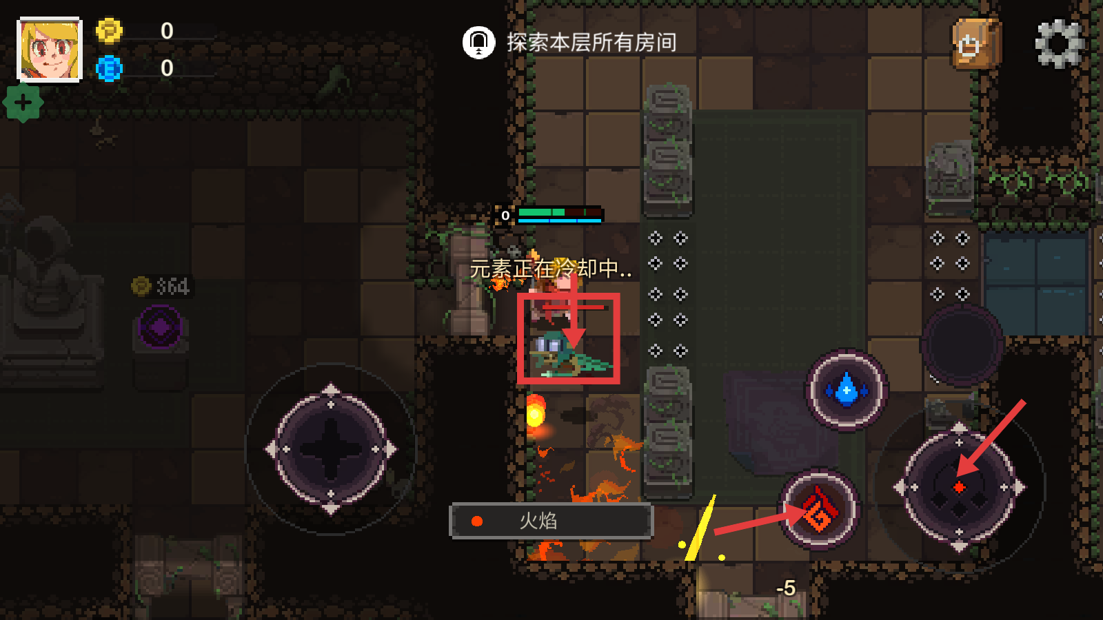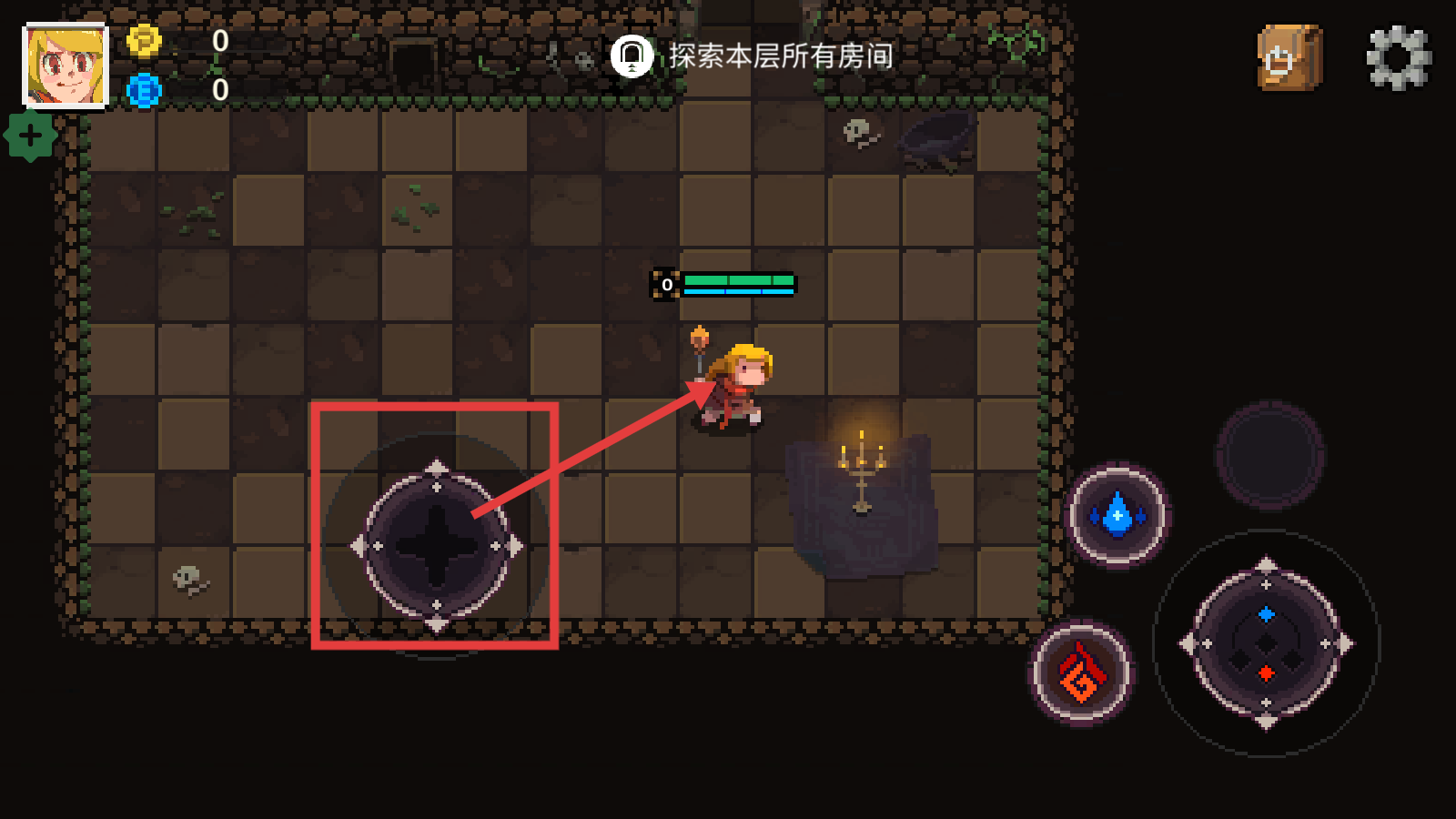 1、进入地牢后,利用【移动摇杆】操控角色移动,目标是【探索本层所有房间】,逐步探索地牢场景,熟悉操作与环境。