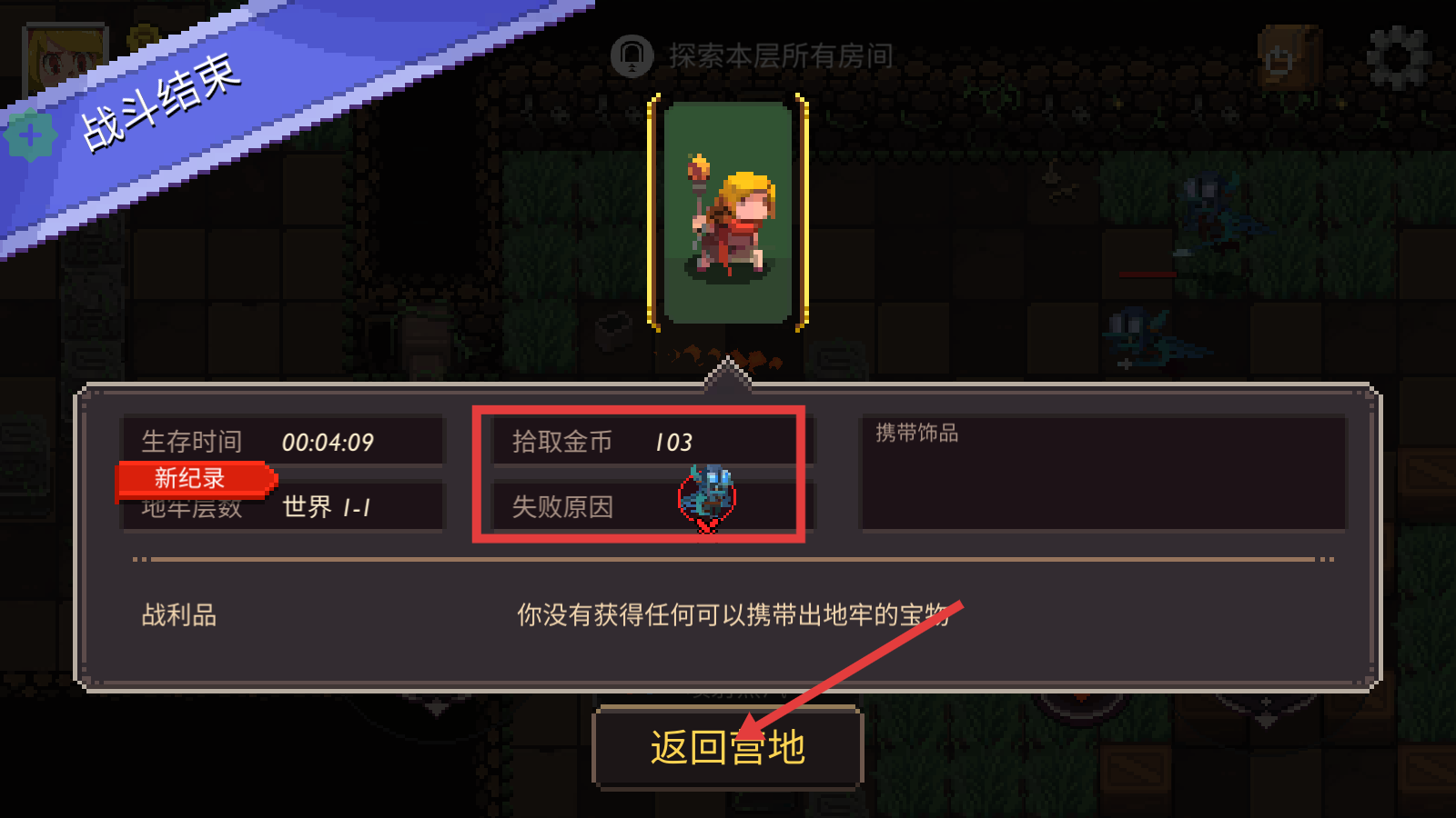 4、战斗结束后,查看【拾取金币-103】和失败原因,点击【返回营地】,总结经验为下次地牢探索做准备。