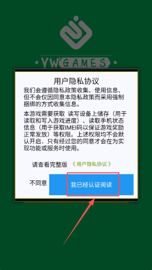 1、阅读协议后点“我已经认证阅读”,授权存储与设备信息,正式进入游戏。