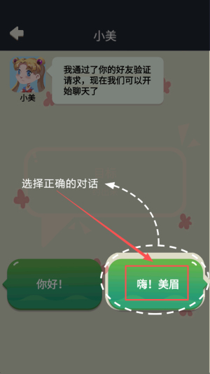 4、收到“小美”消息后,选择正确对话如“你好!”即可通过验证,顺利进入下一关。