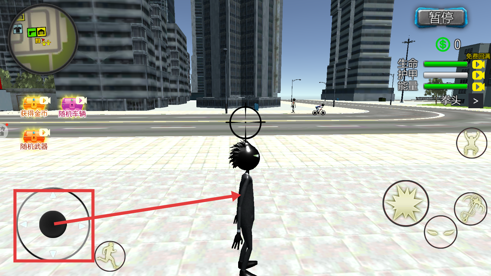 2、利用左下角【虚拟-摇杆】控制角色移动,在城市场景中熟悉操作,开启冒险。