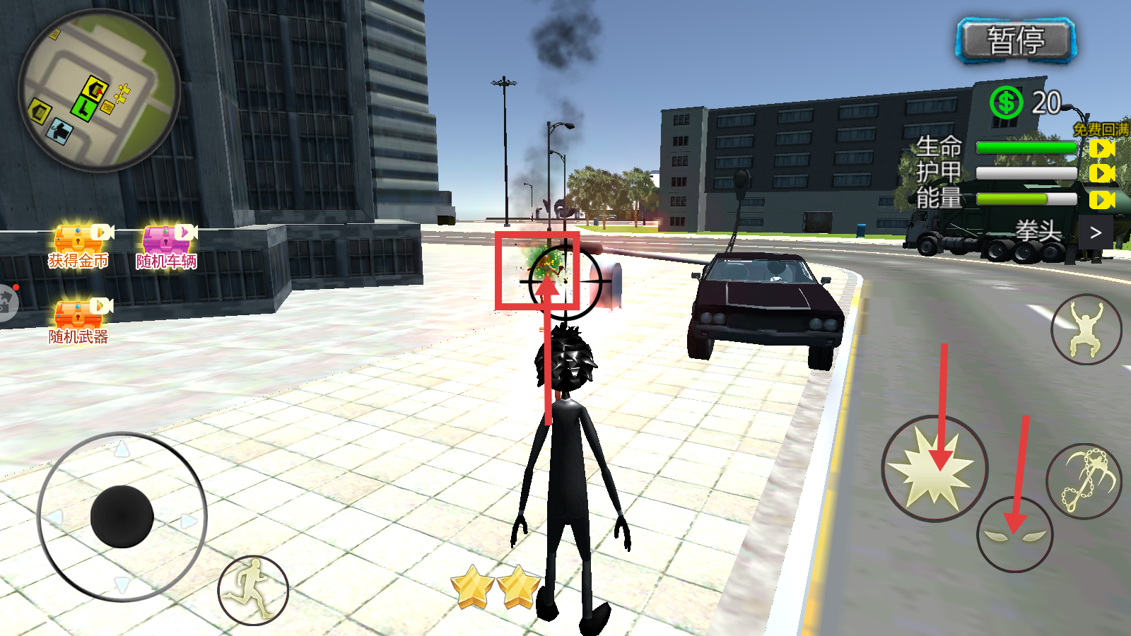 3、战斗时瞄准目标,点击右侧攻击按钮,击败敌人可获取【金币-20】,同时关注生命、护甲和能量状态。