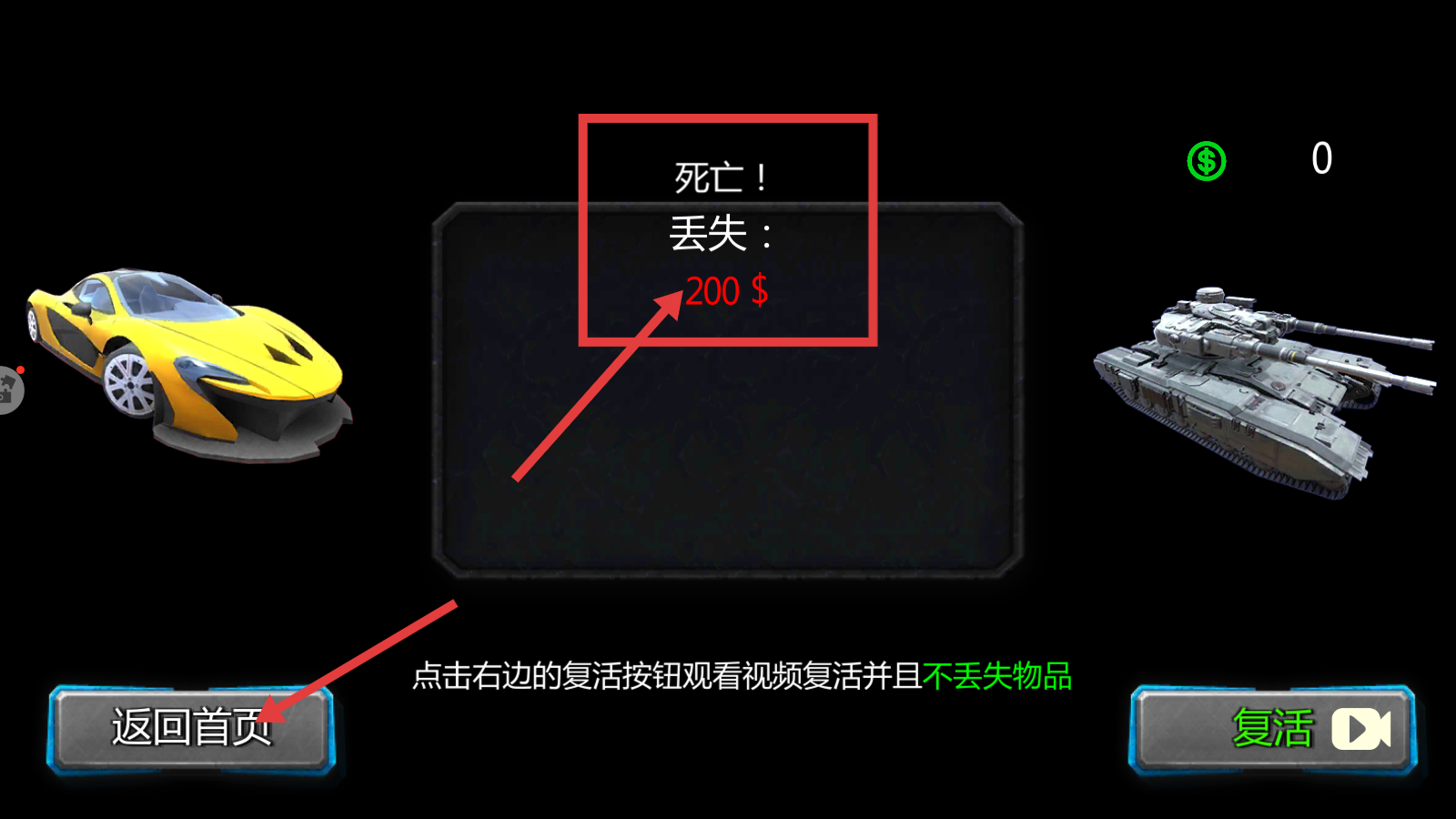 4、若战斗死亡会丢失金币,如【200-$】,可选择【返回首页】或点击【复活】按钮观看视频继续游戏。