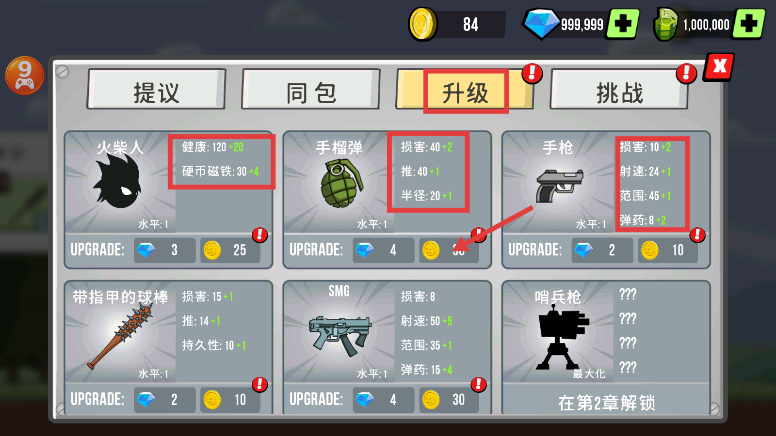 2、在【升级】界面,消耗金币或钻石提升【火柴人】【手榴弹】【手枪】等属性,增强战力。