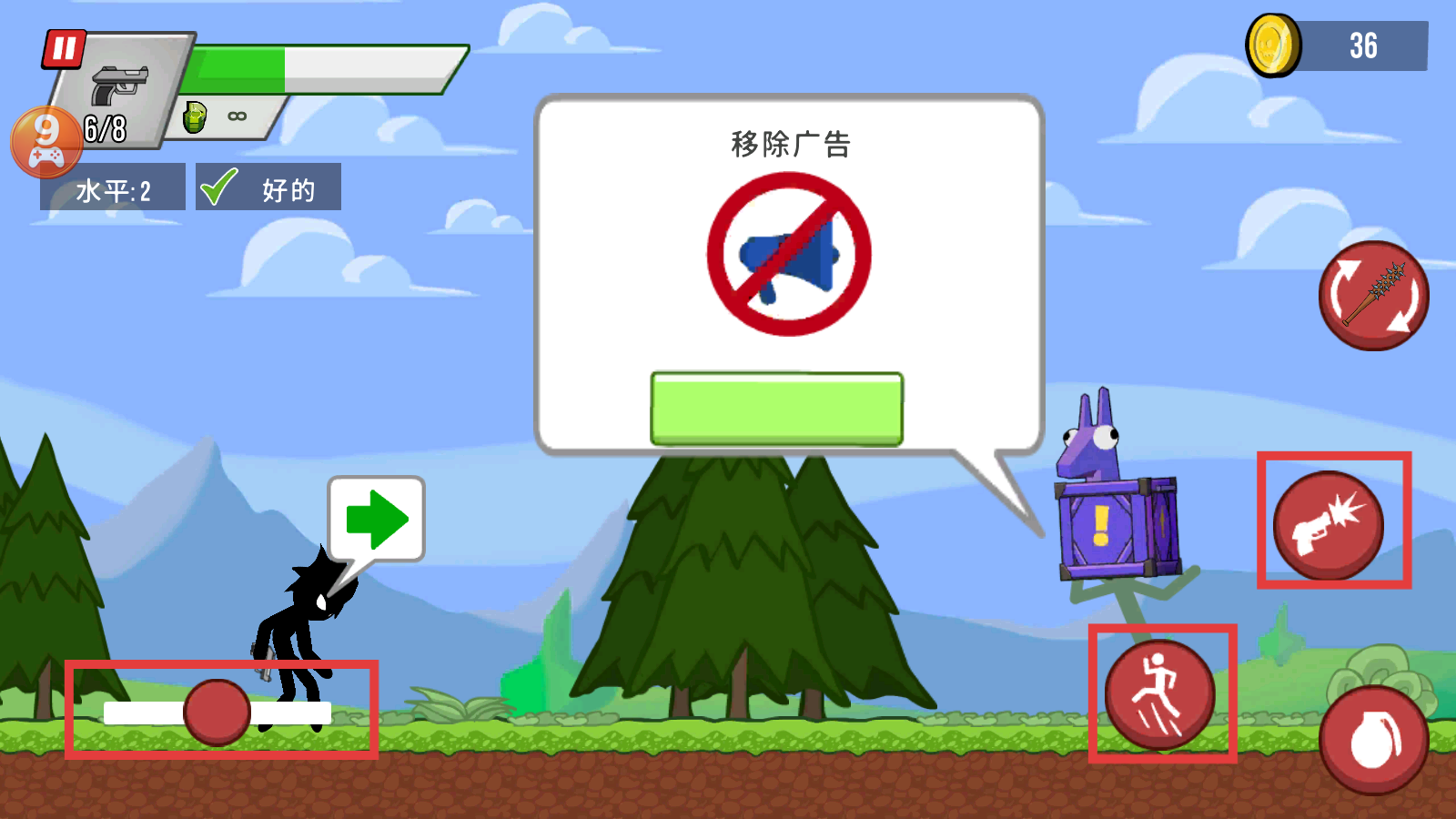 1、利用左侧摇杆移动,点击右侧【跑步】【攻击】按钮行动,可选择移除广告提升体验,积累金币【36-枚】。