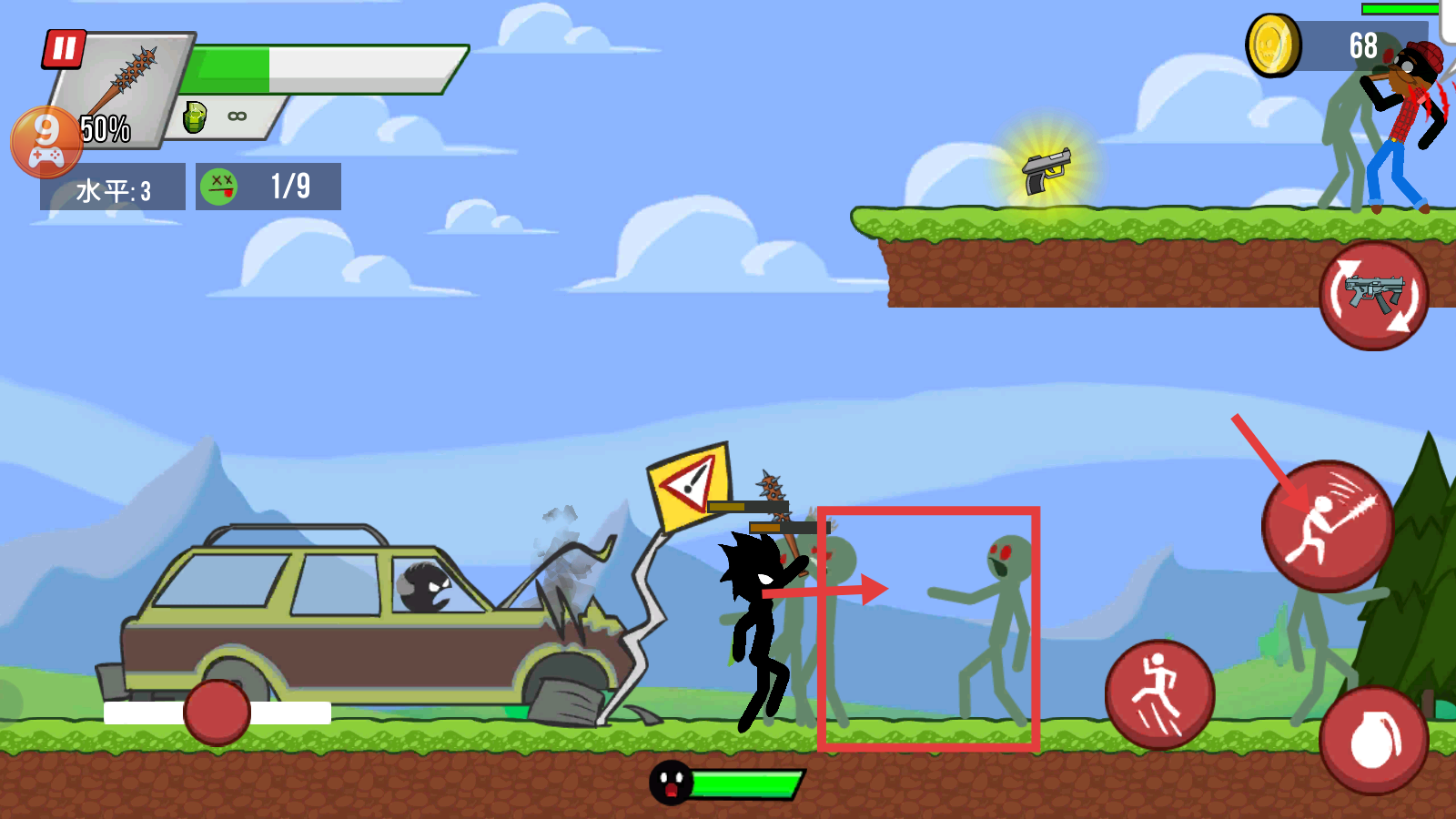 2、战斗时使用武器攻击僵尸,关注【水平-3】和消灭进度【1/9】,获取上方枪械道具增强战力。