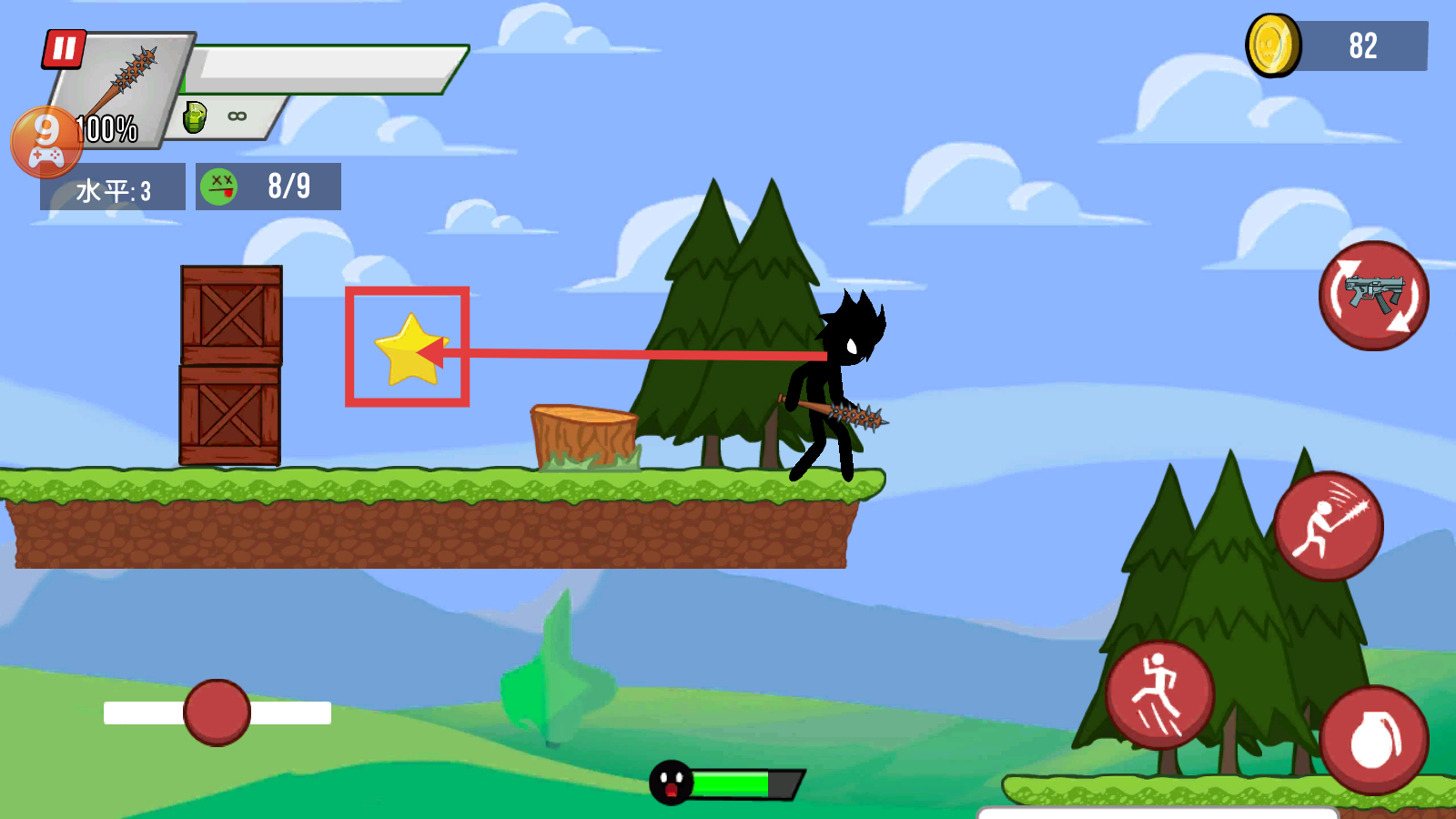 3、收集黄色星星,推进游戏进度,同时留意场景中的木箱等元素,积累资源提升【水平-3】完成度。