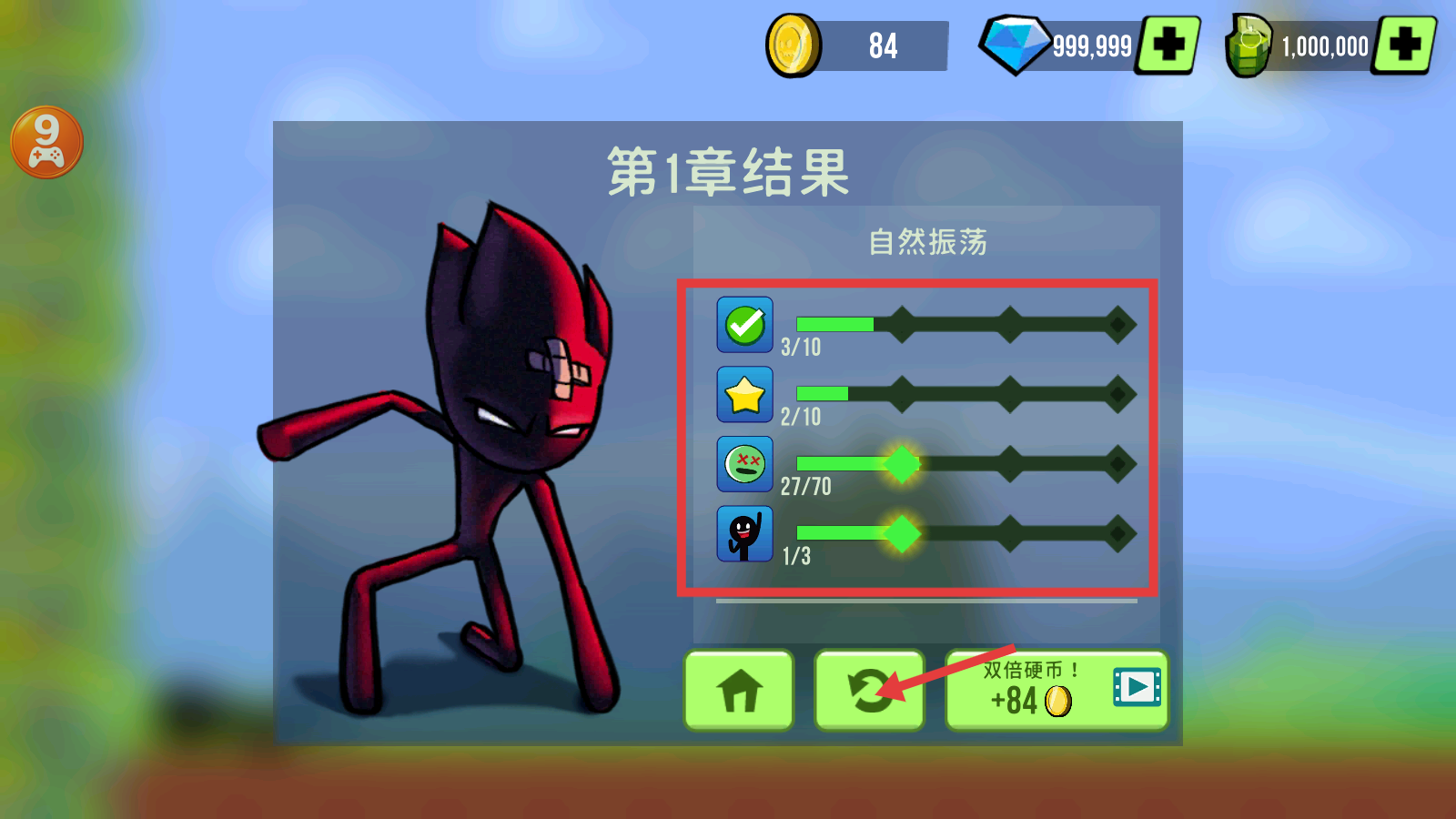 4、章节结束查看【第1章结果】进度,关注各项完成度,点击重置按钮可重新挑战以提升进度和资源获取。