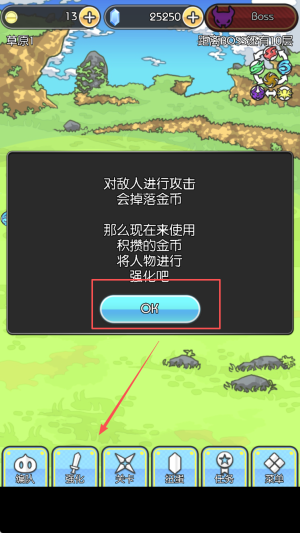 3、如何获取并强化金币:击败敌人掉落金币后点击“OK”,进入强化界面。