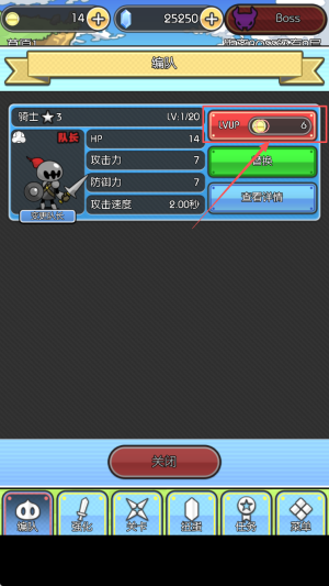 4、如何升级角色:在编队界面选中“骑士★3”,点击“LVUP”即可提升等级。
