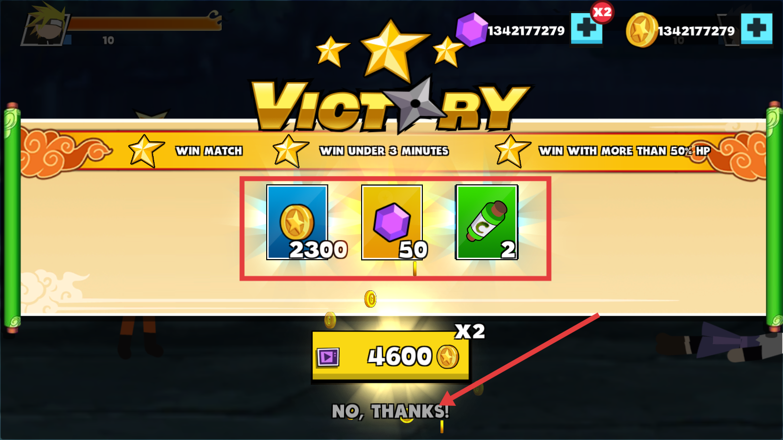 4、胜利后领取【金币-2300】【紫晶-50】【道具-2】奖励,可选择【NO,THANKS!】或观看广告翻倍金币,积累资源用于角色养成。