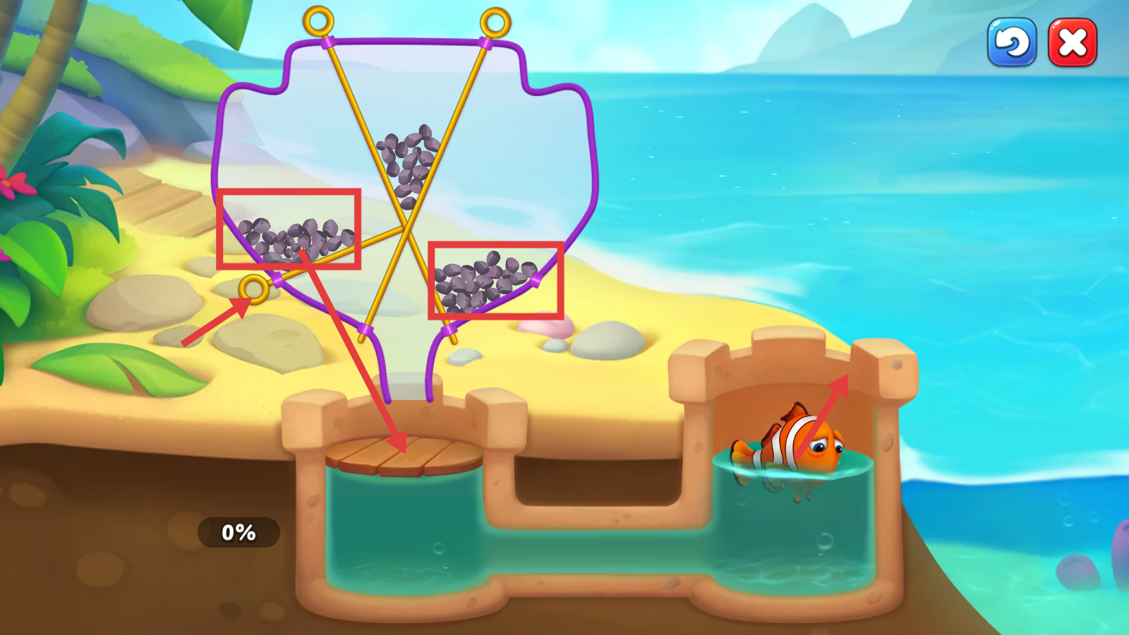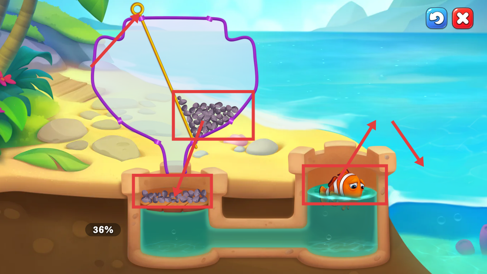 3、继续操作圆环,让更多石块掉落以提升水位,帮助小鱼向目标区域移动,关注进度百分比的变化。