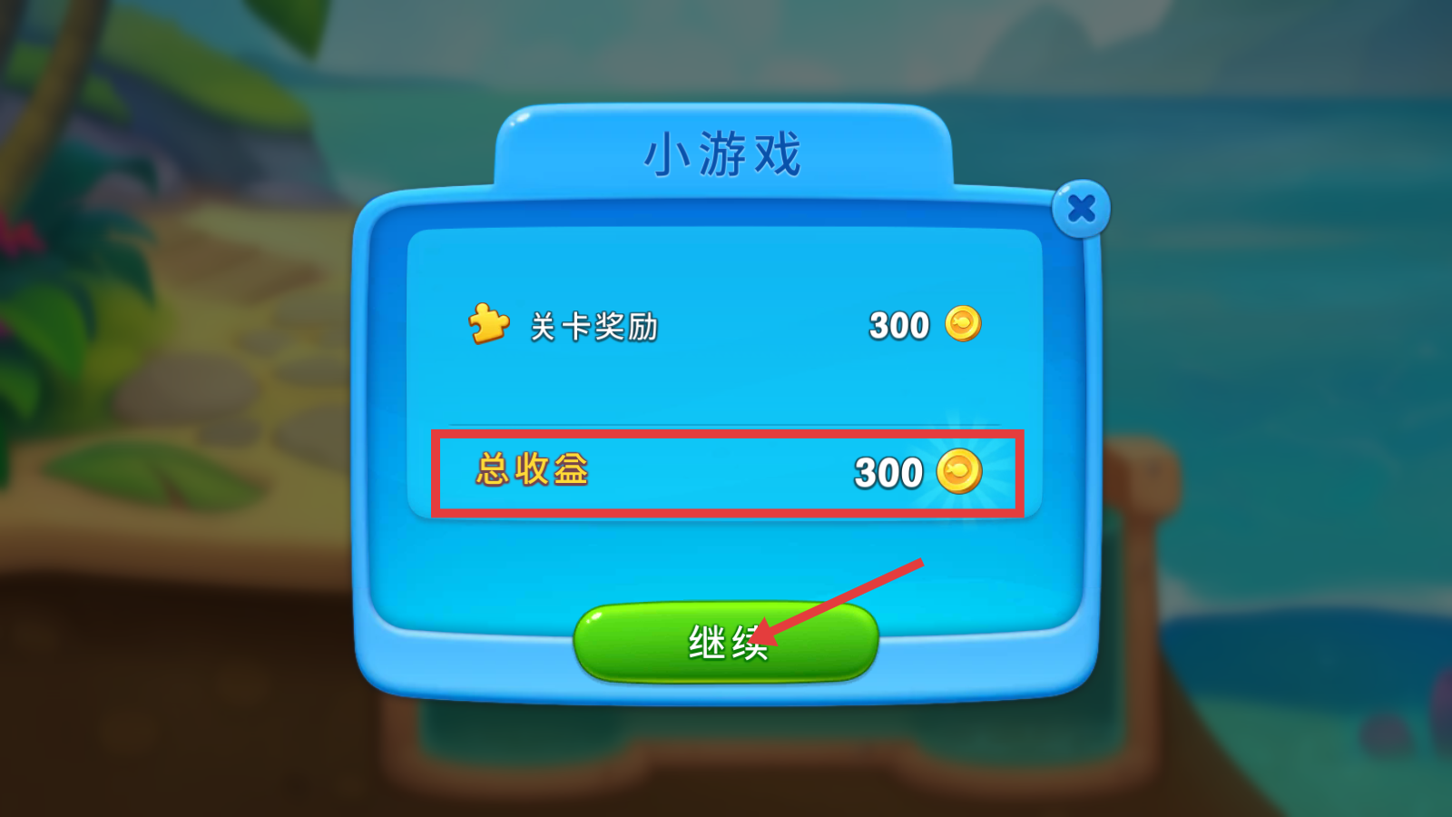 4、完成小游戏后,领取【总收益-300金币】,点击【继续】,积累资源用于后续游戏内容。