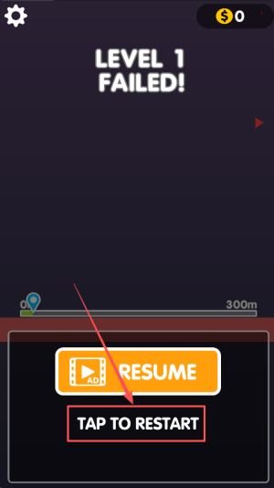 4、出现FAILED时可选RESUME续命,或点TAP TO RESTART重跑,直至越过300米自动过关。