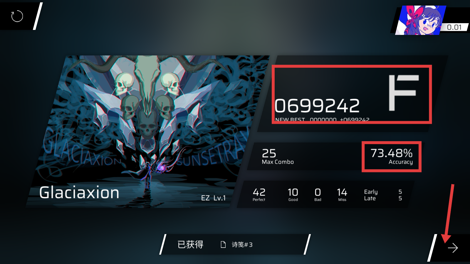 4、关卡结束后查看分数(0699242)与准确率(73.48%),点击箭头继续,积累成绩解锁更多内容。