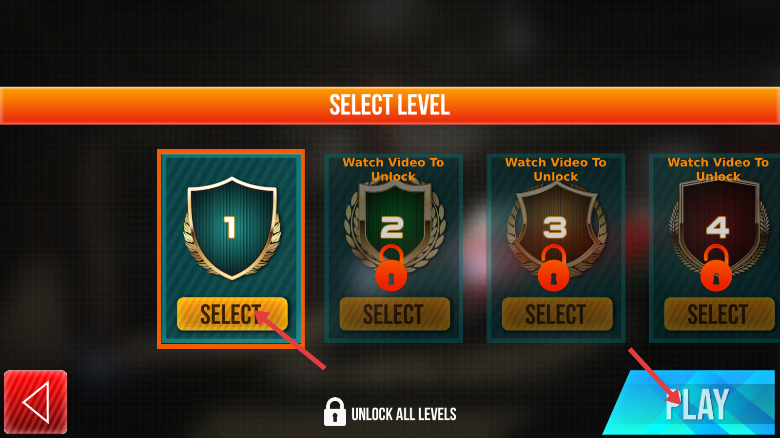 1、在【SELECT-LEVEL】界面点击【SELECT】选择【等级1】,再点击【PLAY】按钮,开启消防救援游戏挑战。