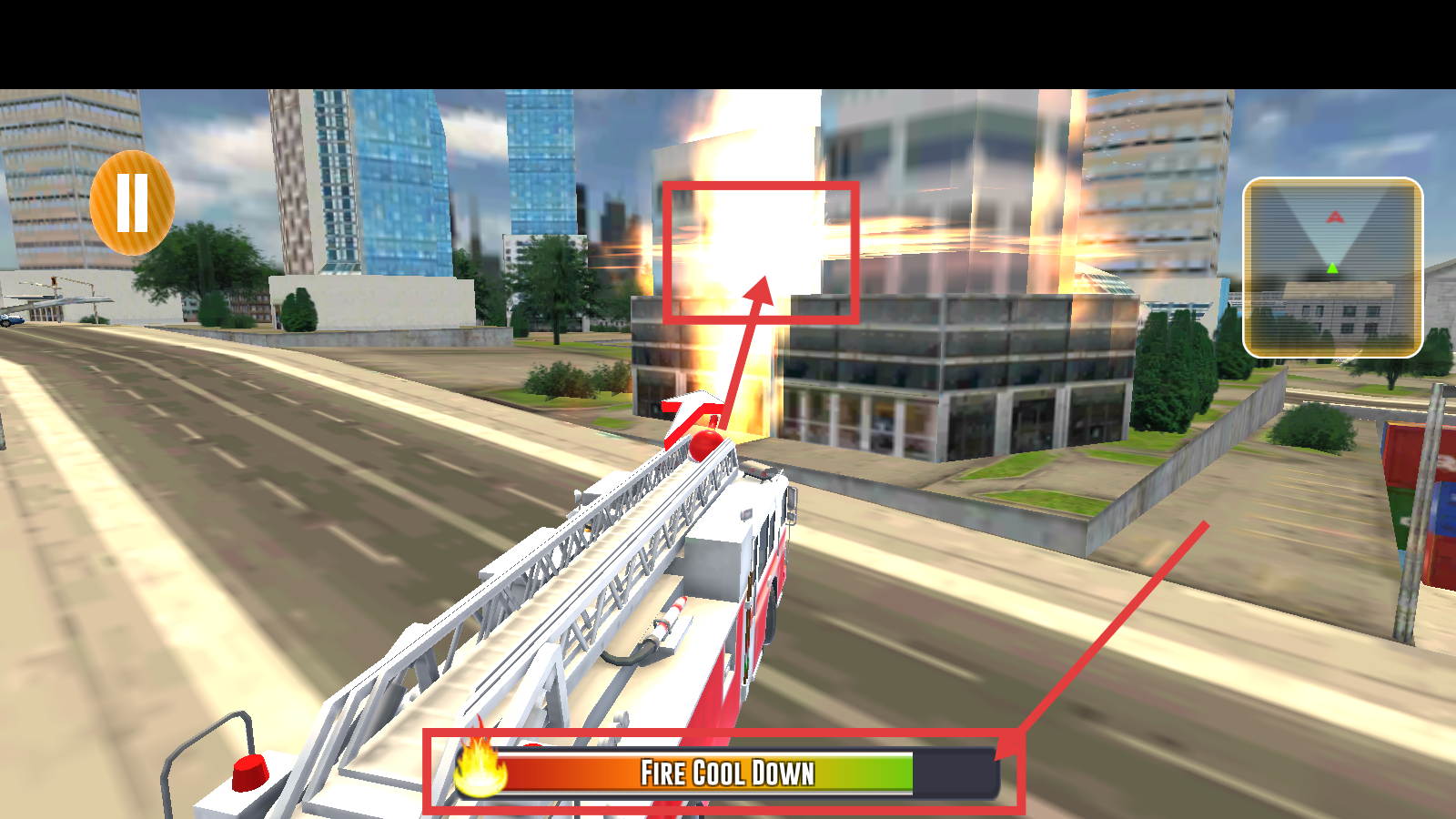 3、抵达火灾建筑后,关注【Fire-Cool-Down】进度条,及时开展灭火操作,控制火势蔓延。