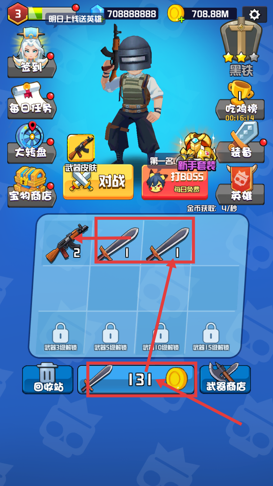 1、利用武器合成系统,将【1级剑-1】等武器合成升级,通过【对战-打BOSS】获取金币资源,提升武器战力。