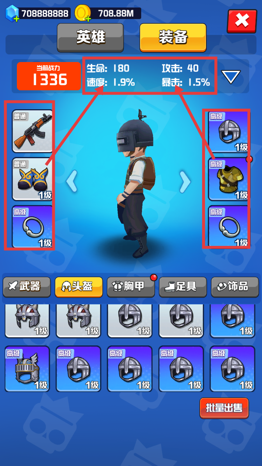 2、在装备界面,搭配【普通-高级】装备,提升【生命-攻击-速度-暴击】属性,强化当前战力1336,助力战斗。