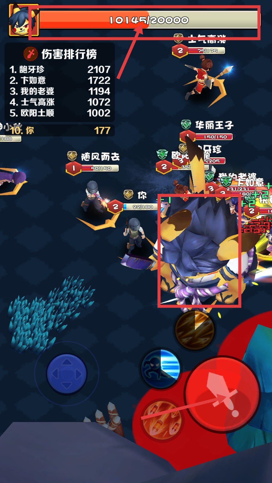 3、参与打BOSS模式,关注BOSS血条【10145/20000】,查看伤害排行榜调整策略,协同队友攻击BOSS提升输出。