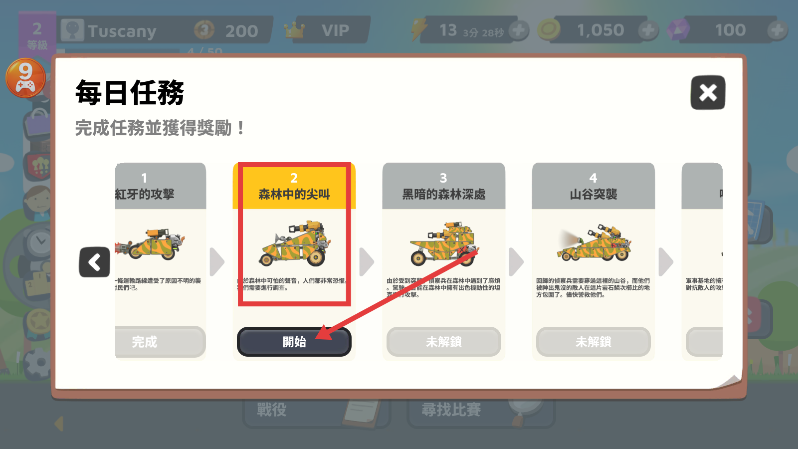 1、完成每日任务【森林中的尖叫】,点击【開始】按钮,推进任务进度,解锁更多任务获取奖励。