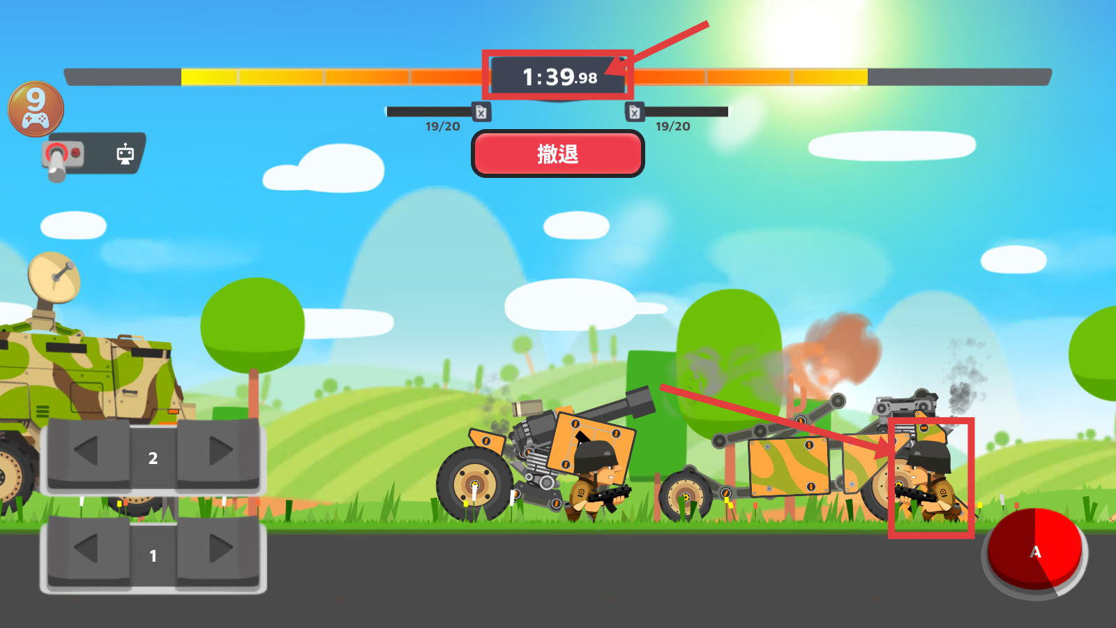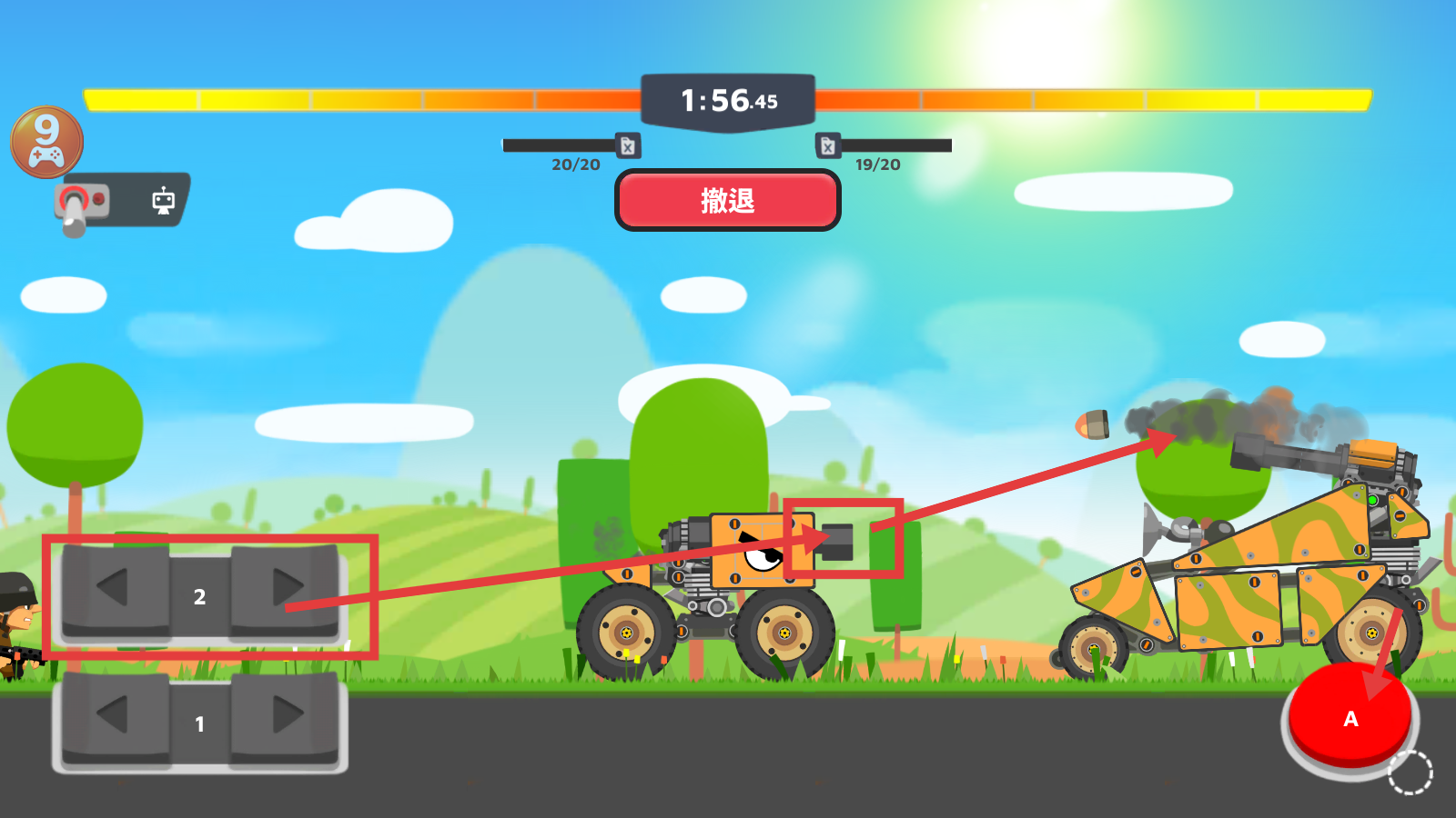 2、战斗中利用【2号方向键】移动坦克,点击红色【A】按钮发起攻击,精准打击敌方坦克。