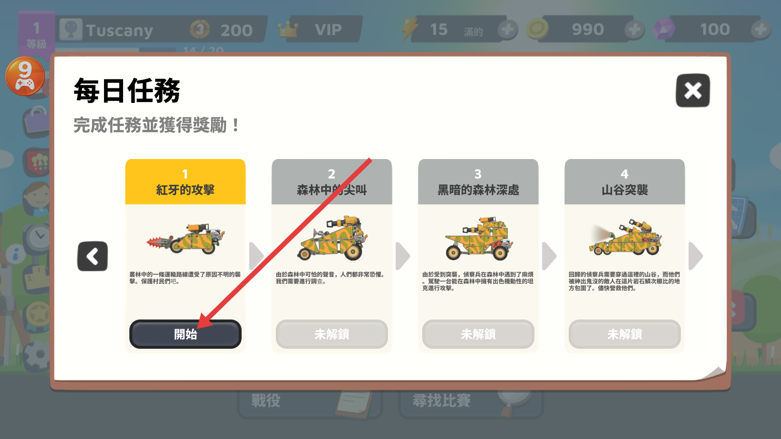 1、参与每日任务【紅牙的攻擊】,点击【開始】按钮,完成任务获取奖励,逐步解锁后续任务。