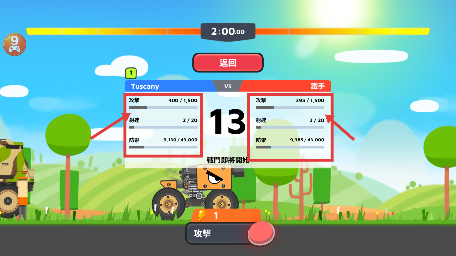 2、对战前查看双方【攻擊-射速-防禦】属性,根据Tuscany和鐵手的属性差异,制定针对性战斗策略。