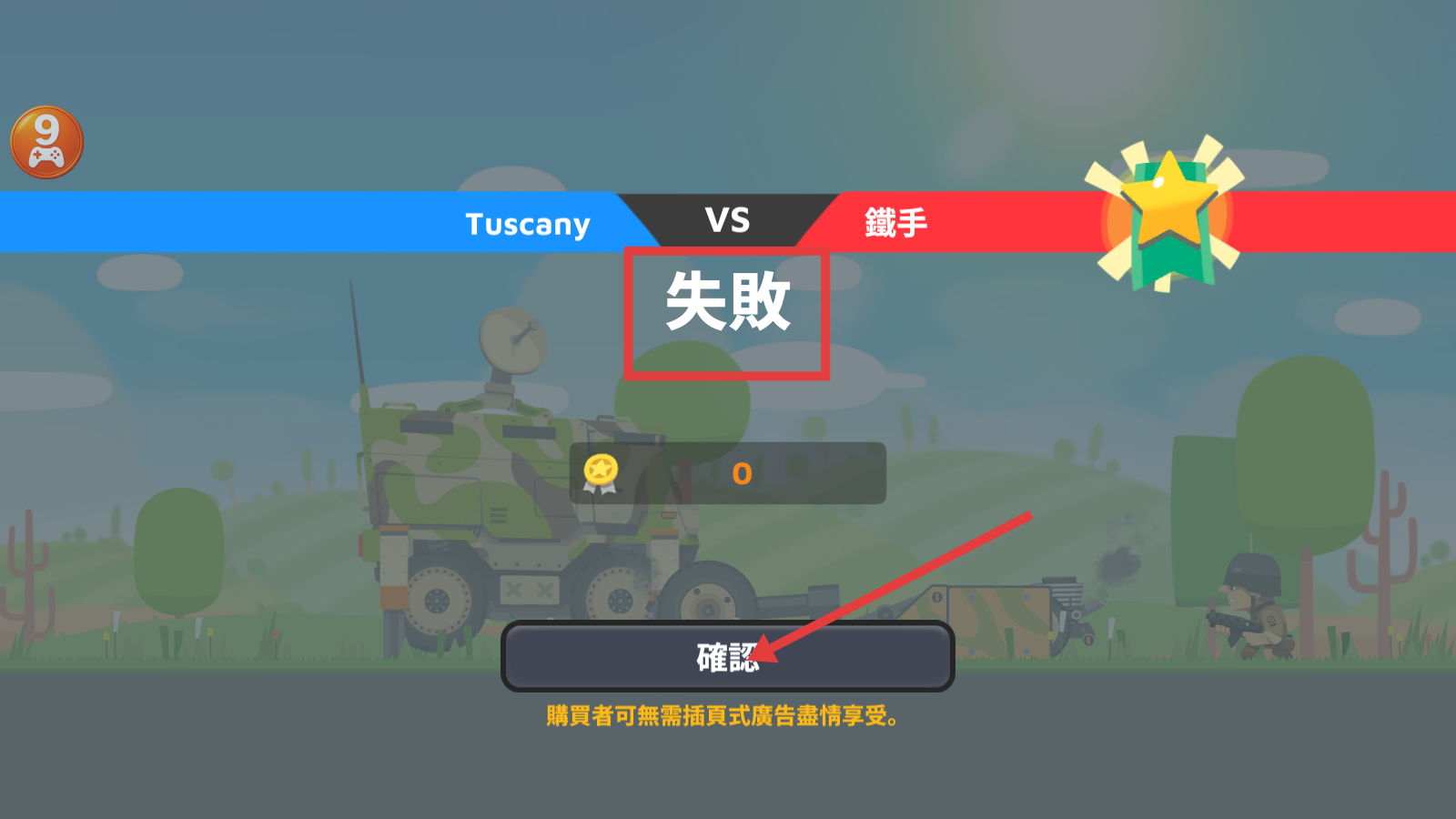 4、若战斗失败,点击【確認】按钮,总结经验,提升坦克属性或调整策略后再次挑战。