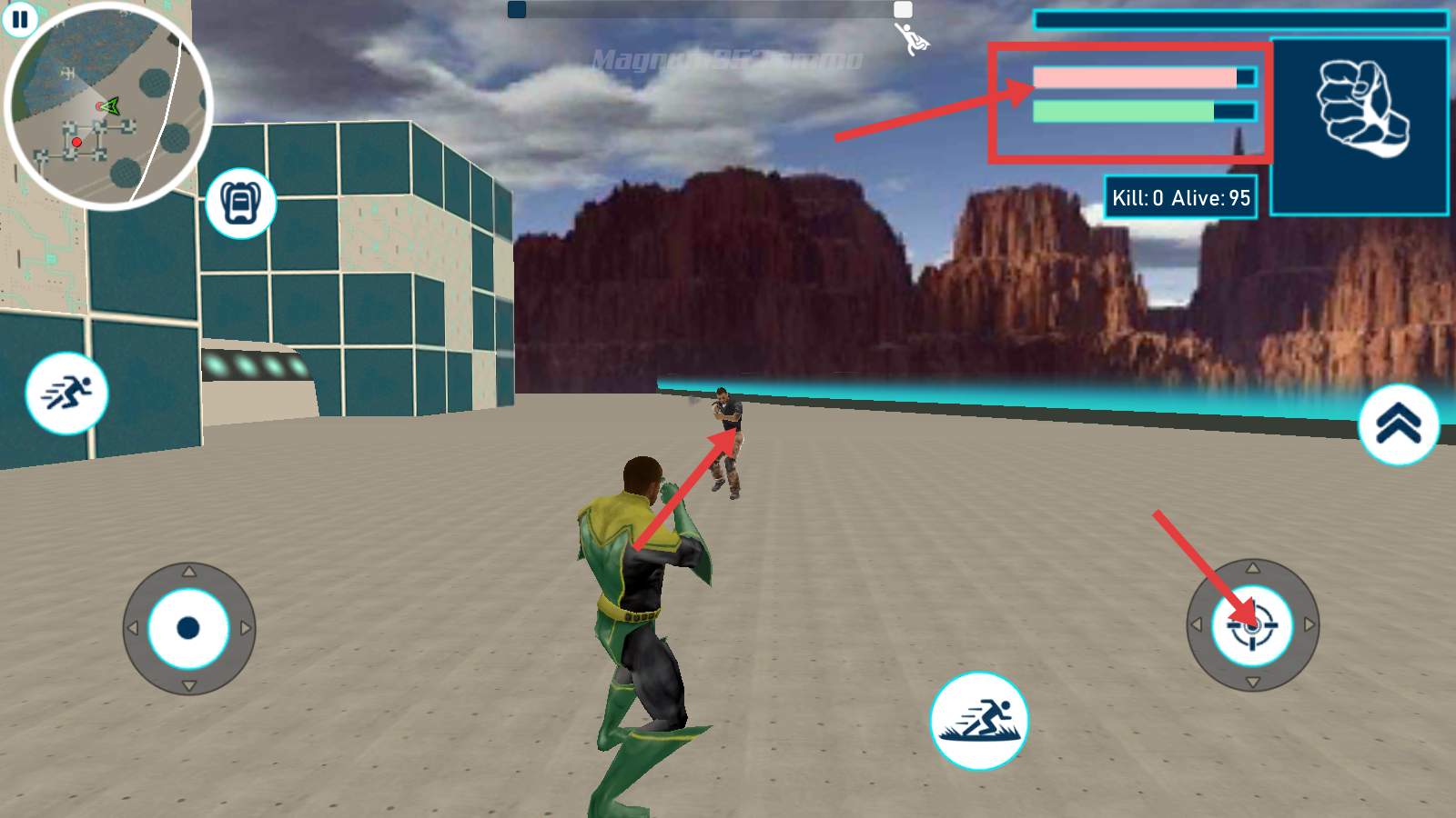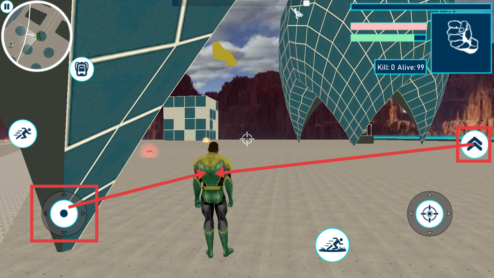 2、操控左侧轮盘和右侧按键,灵活移动超级英雄,探索地图场景。