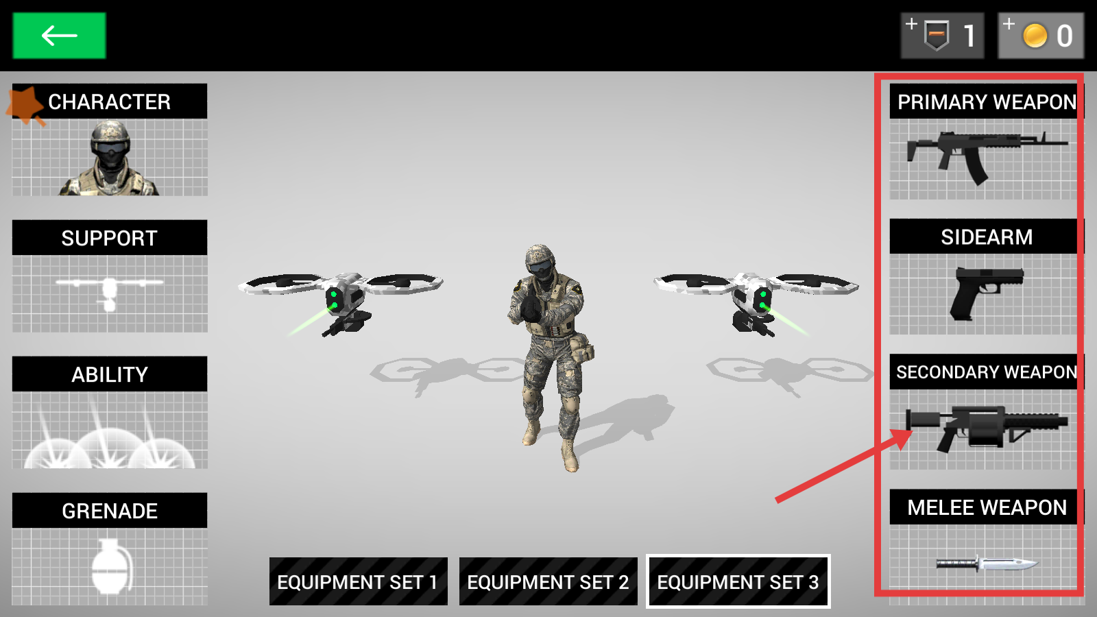 1、在装备界面选择合适的武器套装(如装备套装3),配置主武器、副武器、第二武器和近战武器,根据战斗需求搭配,提升作战能力。