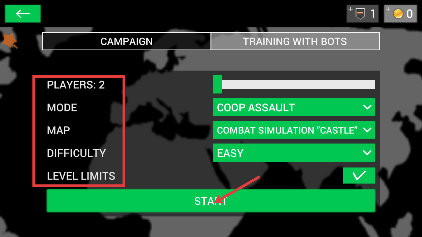 2、进入战役模式,选择合作突击模式,地图选战斗模拟“城堡”,难度设为简单(EASY),点击【START】开启多人合作战斗。