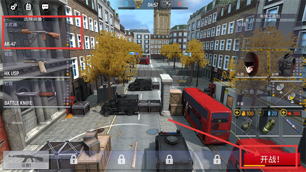 1、选择【主武器-AK-47】,确认装备后点击【开战!】,进入城市场景战斗。