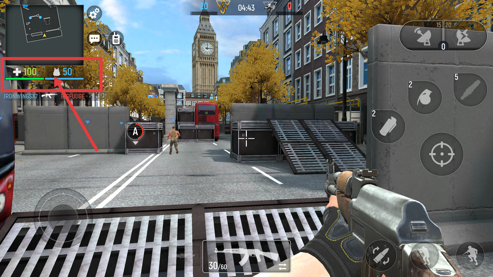 2、战斗中关注【血量+100-护甲50】,操控AK-47在城市场景灵活走位,保持生存与输出。